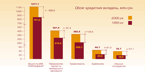 Кредитна політика АКБ "УКРСОЦБАНК" у 2000 році була спрямована на формування якісного та збалансованого "кредитного портфеля" шляхом забезпечення оптимального співвідношення рівня ризику та дохідності від проведення всіх типів кредитних операцій. Доступність, ефективність та надійність дозволили суттєво збільшити обсяг кредитного портфеля і підвищити його якість.
