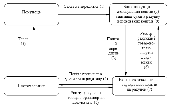 Рис. 7. Схема документообороту при акредитивній формі розрахунків з депонуванням коштів у банку платника.