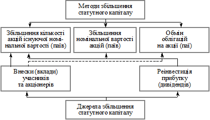 Збільшення статутного капіталу банку здійснюється шляхом випуску нових акцій (паїв), збільшення номінальної вартості акцій (паїв) або обміну облігацій на них. В останньому випадку статутний капітал збільшується на загальну вартість облігацій, що обмінюються на акції (паї). Джерелами збільшення статутного капіталу є власні кошти учасників (акціонерів, засновників), які сформувалися переважно за рахунок нагромадження ними прибутку, а також реінвестиція банківського прибутку (дивіденди). В останньому випадку можуть бути використані цільові фонди, створені за рахунок прибутку після оподаткування або сам нерозподілений прибуток. Ідеться фактично про те, що джерелами формування та збільшення статутного капіталу банку виступають внутрішні джерела як самих учасників (акціонерів), так і банку. Використання внутрішніх джерел банку для збільшення його статутного капіталу фактично означає, що у такому разі розмір власного капіталу банку залишається незмінним. Зміни відбуваються лише всередині, між різними складовими власного капіталу. Змінюється частка власного капіталу, яка приносить дивіденди (статутний капітал), і капіталу, який їх не приносить (нерозподілений прибуток тощо). По суті, збільшення статутного капіталу за рахунок внутрішніх джерел банку є не чим іншим, як фінансування цього збільшення за рахунок дивідендів, невиплачених учасникам (акціонерам). Тому вимоги Національного банку України до власного капіталу банків фактично означають, що останні, вирішуючи питання щодо збільшення статутного капіталу, повинні віддавати (і фактично віддають) перевагу такому джерелу, як додаткові внески (вклади) учасників (акціонерів). Однак це не применшує ролі внутрішніх джерел у формуванні як статутного капіталу, так і (особливо) інших складових власного капіталу банку.