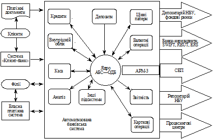 АБС — це технологічна система, яка забезпечує функціонування банківської установи. Ядром АБС є підсистема ОДБ, яка інформаційно зв’язана з іншими функціональними підсистемами.