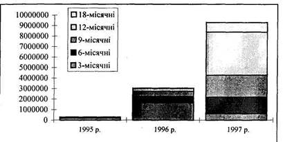 Рис. 6.2. Динаміка продажу облігацій за 1995—1996 рр. та за 1997 р. (за номіналом)