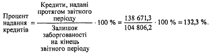 За цим показником можна дізнатися, скільки кредитів залишилося непогашеними з виданих у минулому звітному періоді. У наведеному прикладі залишок позикової заборгованості не перевищує розміру щойно виданих кредитів. Це позитивно характеризує діяльність банку щодо аналізу руху кредитів. Той самий показник можна розрахувати за короткостроковими та довгостроковими позиками. Вони дорівнюють відповідно 140,4 % та 98,8 %. Це говорить про те, що якщо залишок позикової заборгованості за короткостроковими кредитами на кінець періоду нижчий розміру щойно виданих за звітний період кредитів, то щодо довгострокових кредитів спостерігається протилежна тенденція.
