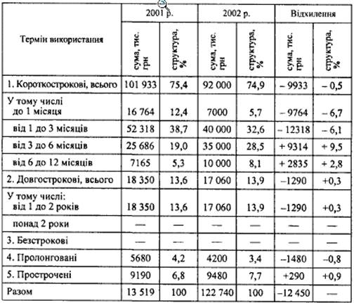 Наведений приклад свідчить, що за аналізований період структура кредитів за строками використання майже не змінилася. Питома вага короткострокових позик у звітному періоді становила 74,9 %. У попередньому періоді вона дорівнювала 75,4 %. Довгострокові кредити були надані згідно з державною цільовою програмою конверсії на переозброєння виробництва та на споживчі цілі фізичним особам. Причому порушення строків погашення спостерігалося не за довгостроковими кредитами, а за короткостроковими. Частка пролонгованих та прострочених кредитів майже не змінилась і в аналізованому періоді становила— 11,1 %. Дещо збільшилася питома вага прострочених кредитів (на 0,9 процентного пункту).