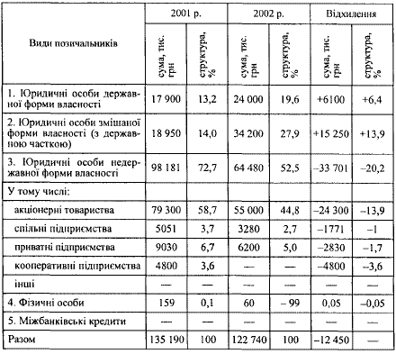Як свідчать дані табл. 5.14 міжбанківські кредити в аналізованому періоді не надавалися. Найбільшою є частка кредитів виданих недержавним юридичним особам — 52,5 % (у попередньому періоді — 72,7 %). Серед них найбільше видавалося кредитів акціонерним товариствам (відповідно 44,85 % у звітному періоді, та 58,7 % — у базисному). Зросла частка кредитів, виданих юридичним особам державної форми власності, з 13,2 до 19,6 % у звітному періоді, та частка кредитів, виданих юридичним особам змішаної форми власності з державною часткою з 14 % у базисному періоді до 27,9 % у звітному. Це пояснюється цілеспрямованою роботою щодо підтримання державних підприємств.