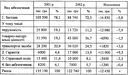 Аналіз можна продовжувати в напрямі більш глибокого вивчення структури за видами забезпечення (застава майна позичальника, гарантія або поручительство, договір страхування тощо).