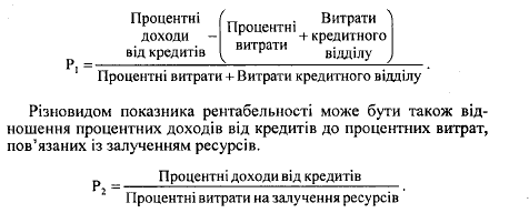 Рентабельність кредитних операцій може бути проаналізована за допомогою низки показників, які доповнюють один одного. Рентабельність кредитних операцій (Рі) розраховується діленням прибутку від кредитних операцій на витрати, пов'язані із залученням ресурсів та функціонуванням кредитного відділу: