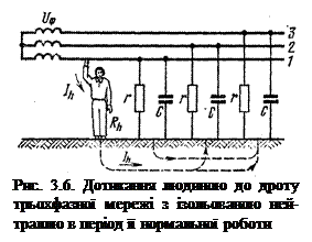З (3.18) слідує, що в мережах з ізольованою нейтраллю, які володіють незначною ємністю між дротами і землею, небезпека для людини, що до-торкнулася однієї з фаз в період нормальної роботи мережі, залежить від опору дротів відносно землі: із збільшенням опору небезпека зменшується.
