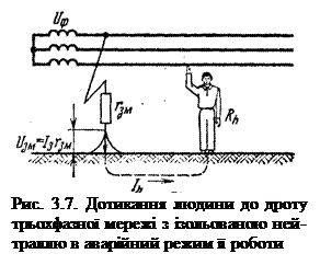 , тому напруга, під якою буде людина, що торкнулася в аварійний період до здорової фази трьохфазної мережі з ізольованою нейтраллю, буде значно більше фазової і дещо менше лінійної. Таким чином, цей випадок дотикання в багато разів небезпечніший дотикання до тієї ж фази мережі при нормальному її режимі роботи (що видно з порівняння (3.20) і (3.18) враховуючи, що