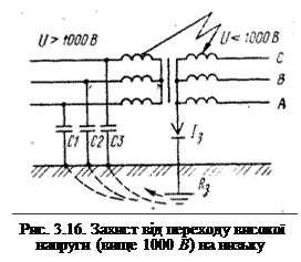 Розглянемо схему захисту за допомо-гою пробивного запобіжника в мережах трьохфазного струму з ізольованою ней-траллю (рис. 3.16).