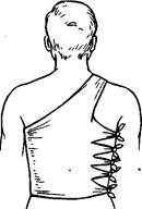При відсутності табельних перев'язних засобів використовують підручні засоби. Особливо зручні ощадливі пов'язки по Маштафарову. Їх накладають, використовуючи шматки тканини (простирадла, сорочки й ін.) різної величини, кінці яких надрізають для одержання тасьм. Спочатку на рани накладають стерильний бинт чи серветку (при необхідності і вату), а потім шматком тканини із зав'язками закріплюють пов'язку (рис. 5.1).