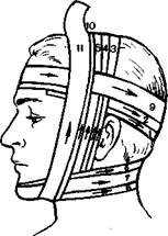 На рани волосистої частини голови накладається пов'язка – “чепець” (рис. 5.2), яка зміцнюється смужкою бинту за нижню щелепу. Від бинта відривається шматок розміром до 1 м і кладеться серединою поверх стерильної серветки, що закриває рану на області тімені, кінці його спускають вертикально вниз перед ушима і утримують у натягнутому стані. Навколо голови роблять круговий закріпляючий хід (1), потім, дійшовши до зав'язки, бинт обертають навколо її і ведуть косо на потилицю (3). Чергуючи ходи бинта через потилицю і чоло (2 .12), щораз направляючи його більш вертикально, закривають усю волосисту частину голови. Після цього 2 .3 круговими ходами зміцнюють пов'язку. Кінці зав'язки зав'язують бантом під підборіддям.
