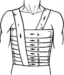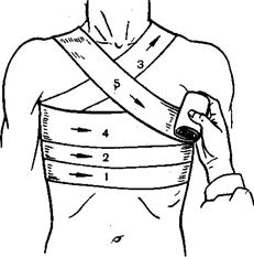 На груди накладають спіральну чи хрестоподібну пов'язку. Для спіральної пов'язки (рис. 5.5, а) відривають кінець бинта довжиною близько 1,5 м, кладуть його на здорове надпліччя і залишають висіти косо на грудях. Бинтом, починаючи знизу зі спини, спіральними ходами (2 .9) бинтують грудну клітину. Вільно висячі кінці шматка бинта зв'язують.