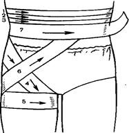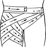 Вона починається з кругових ходів навколо живота (1 .3), потім хід бинта по зовнішній поверхні стегна (4) переходить довкола нього (5) по зовнішній поверхні (6), і далі знову роблять кругові ходи навколо живота (7). При великих опіках живота можуть накладатися косиночні пов'язки.