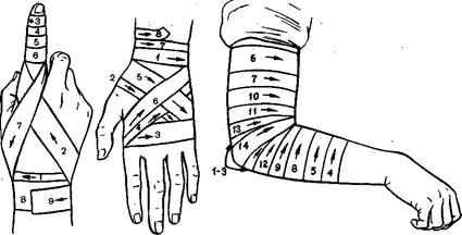 Спіральну пов'язку на палець (рис. 5.8, а) починають ходом навколо зап'ястя (1), далі бинт ведуть по тилу кисті до фаланги (2) і роблять спіральні ходи бинта від кінця до підстави (3 .6) і зворотним ходом по тилу кисті (7) закріплюють бинт на зап'ясті (8 .9).