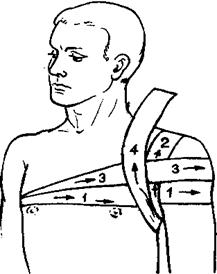 Пов'язку на плечовий суглоб (рис. 5.9) накладають, починаючи від здорової сторони з пахової западини по грудям (1) і зовнішньої поверхні ушкодженого плеча позаду через пахову западину на плече (2), по спині через здорову пахову западину на груди (3) і, повторюючи ходи бинта, поки не закриють суглоб, закріплюють кінець бинта на грудях шпилькою.