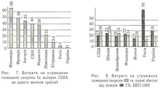 В порівнянні з економічно розвинутими країнами світу в Україні відносні показники кількості пожеж та людей, що загинули на них, є значно вищими (рис. 4 та 5). Це, в першу чергу, пов'язано із складним соціально-економічним становищем у нашій країні, недостатньою чисельністю особового складу Державної пожежної охорони України (рис. 7). Порівняльні дані про витрати на утримання пожежної охорони та прямі збитки від пожеж наведені на рис. 8 у частках валового внутрішнього продукту (ВВП) відповідної країни (за даними Всесвітнього центру пожежної статистики ООН, середній показник).