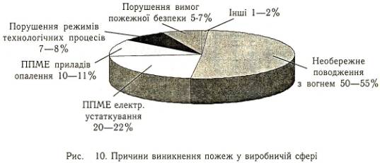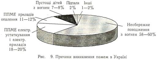 Для успішного проведення дієвих упереджувальних заходів у виробничій сфері та у країні загалом, важливо знати основні причини пожеж. Згідно зі статистичними даними основними причинами пожеж в Україні є: необережне поводження з вогнем 58-60%; порушення правил монтажу та експлуатації (ППМЕ) електроустаткування та побутових електроприладів 18-20%; ППМЕ приладів опалення 11-12%; пустощі дітей з вогнем 7-8%; підпали 2% (рис. 9). У виробничій сфері основні причини пожеж та їх показники змінюються не суттєво (рис. 10).
