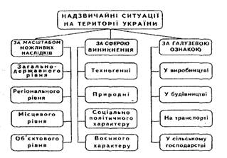 Надзвичайні ситуації, які можуть виникати на території України (рис. 2.1) і здійснювати негативний вплив на функціонування об'єктів економіки та життєдіяльність населення у мирний і воєнний час, поділяються за наступними основними ознаками:
