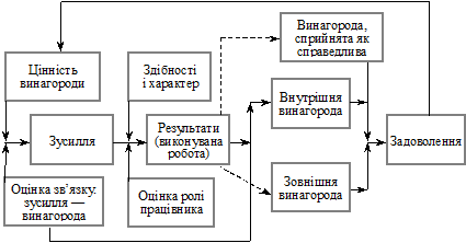 Згідно з цією моделлю мотивації досягнуті результати залежать від докладених працівником зусиль, його здібностей, характеру та усвідомлення своєї ролі. Рівень цих зусиль визначається цінністю винагороди і рівнем впевненості в тому, що між затраченими зусиллями і можливою винагородою існує тісний зв’язок. Досягнуті результати обумовлюють внутрішню (почуття компетентності, самоповаги) і зовнішню (премія, похвала, просування по службі) винагороду працівника. Результатом зовнішніх і внутрішніх винагород з урахуванням їх справедливості є задоволення у працівника. Останнє залежить від цінності винагороди, яка не однакова в різних працівників. Усе це свідчить про те, що механізм мотивації праці складний і вимагає всебічного врахування індивідуальних психологічних особливостей працівників, їхніх потреб, інтересів, спрямованості, ціннісних орієнтацій.
