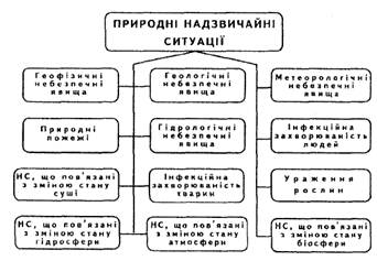 Природні надзвичайні ситуації класифікують за видами можливих природних явищ, що призводять до їх виникнення: * небезпечні геологічні, * метеорологічні, * гідрологічні морські та прісноводні явища, * деградація ґрунтів чи надр, * природні пожежі, * зміна стану повітряного басейну, * інфекційна захворюваність людей та сільськогосподарських тварин, * масове ураження сільськогосподарських рослин хворобами і збудниками, * зміна стану водних ресурсів і біосфери тощо.