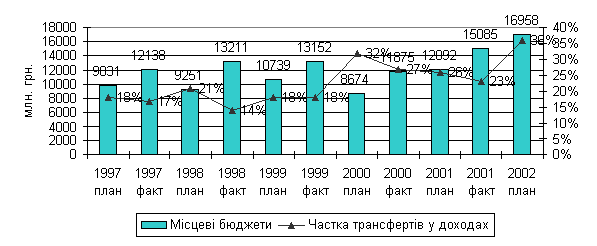 Рис. 3. Динаміка трансфертів у загальному обсязі доходів місцевих бюджетів за 1997 – 2002 роки [48, с.134].