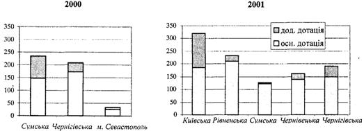 2001 року, додаткову дотацію отримали вже п'ять місцевих бюджетів: Київська, Рівненська, Сумська, Чернівецька і Чернігівська області. Загальний обсяг додаткової дотації' становив 2243 млн грн, або 5,9 відсотка від суми основної дотації, отриманої цими бюджетами (3780,6 млн грн).