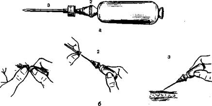 Рис. 5.13. Шприць-тюбик: а – загальний вид: 1 – корпус, 2 – капсула з голкою, 3 – захисний ковпачок, б – використання: 1 – проколювання мембрани в корпусі поворотом капсули до упора, 2 – знімання ковпачка з голки, 3 – положення при введенні голки у тканини.