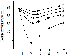 Рис. 11.1. Вплив шуму на концентрацію уваги (1 — до впливу шуму; 2 — зразу після впливу; 3—5 — через 30, 60 і 120 хв після впливу; інтенсивність шуму: а — 60 дБ, б — 70 дБ, в — 80 дБ, г — 90 дБ, д — 100 дБ)