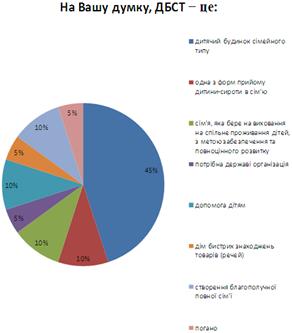 Згідно з даними на рис.2.3 ми можемо зробити висновок, що всі студенти дали визначення поняття ДБСТ, але всі визначення суттєво відрізняються один від одного. 45 % опитуваних дали таке визначення: це дитячий будинок сімейного типу. Також у одного опитуваного негативне ставлення: він визначив, що ДБСТ – це погано.