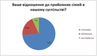 Як видно з рис. 2.4 у більшості опитуваних студентів Сумського державного педагогічного університету ім. А.С. Макаренка відношення до прийомних сімей в нашому суспільстві є позитивним, тобто більшість людей не є байдужими до життя інших. Один з опитуваних студентів зазначив, що «я до цього зовсім не маю ніякого відношення».