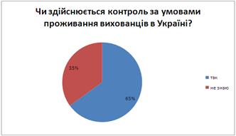 65% опитуваних вважають, що здійснюється контроль за умовами проживання вихованців в Україні, 35% опитуваних зовсім не знають, щодо контролю за умовами проживання.