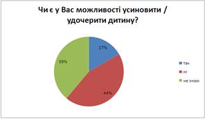 Згідно з результатами опитування, представленими на рис. 2.6 можна зробити висновок, що думки респондентів дещо розділилися. У більшості не має можливості усиновити / удочерити дитину. 39% ще не знають, а 17% мають можливість. Один з опитуваних зазначив, що «зараз недостатня матеріальна можливість, але планую через 5−6 років».