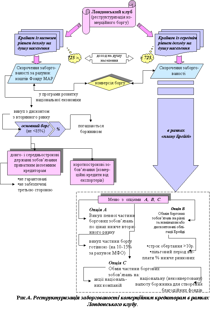 зниження боргу і його обслуговування в рамках “плану Брейді”, запропонованого адміністрацією США у 1989 році, чи конверсії боргів для країн із середнім рівнем доходу (рис. 4).