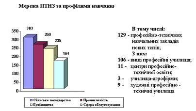 Проводиться робота щодо оптимізації та впорядкування мережі професійно-технічних навчальних закладів за умови збереження учнівських місць, а відтак і робочих місць педагогічних працівників, здійснюються реальні кроки щодо скорочення спеціалізацій і збільшення підготовки фахівців за інтегрованими професіями. Збільшилась до 129 кількість професійно-технічних навчальних закладів нових типів. Навчання у ПТНЗ здійснюється з 342 професій.