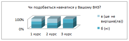 На запитання «Чи подобається навчатися у Вашому ВНЗ?» переважна частина студентів-першокурсників (40%) дала відповідь «так». 30% студентам не подобається навчатися і 30 % ще не вирішили. При опитуванні студентів другого курсу 30 % студентів відповіли «так», 25 % - ні і 45% студентів ще не вирішили(діаграма 2). Невпевненість студентів у тому чи подобається їм навчатися в своєму ВНЗ свідчить про те, що під час вибору навчального закладу вони були не зовсім зорієнтовані у професійному виборі. Адже під час дослідження було виявлено таку закономірність: студентам, які мріяли навчатися саме тут, подобається навчання, вони ціле направленні і впевненні в собі.
