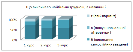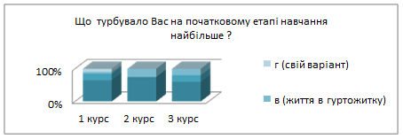 Незважаючи на той факт, що переважній більшості студентів подобається навчання, на початковому етапі навчання найбільше турбувало навчання: 65 % студентів першого курсу, 75 % - другого та 60 % третього курсів. (діаграма 3)