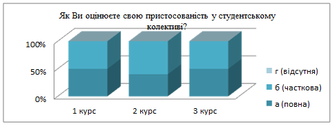 Проте студентське життя – це не лише навчання, це спілкування з одногрупниками, громадське життя, проведення вільного часу. Так, на питання «Як Ви оцінюєте свою пристосованість у студентському колективі? » майже однакова кількість студентів дала як позитивну так і негативну відповіді. 50% студентів першокурсників вважають свою пристосованість повною і 50% - частковою. Такий же показник виявився і у студентів третього курсу. Повністю пристосованими вважає себе лише 40% студентів-другокурсників і нажаль 60% з частковою пристосованістю. (діаграма 5)