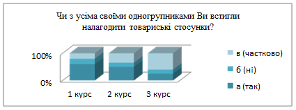 На пристосованість до студентського колективу впливають такі чинник як: ставлення групи, наявність друзів, відношення викладачів та інші. Так на запитання «Чи з усіма своїми одногрупниками Ви встигли налагодити товариські стосунки? » 60% студентів першого курсу відповіли «так», 20% - «ні» та 20% дали відповідь «частково». Студенти другого курсу відповіли так: 50% -«так»; 15% -«ні», 35% -«частково». Досить цікавими виявилися відповіді студентів третього курсу, лише 25% студентів встигли налагодити товариські відносини з усіма одногрупниками, 60% - частково налагодили відносини і 15% - зовсім не налагодили відносини з одногрупниками. Це свідчить про те, що на третьому курсі студенти вже вирішили з ким їм краще товаришувати і спілкуються лише з певними студентами, що часто призводить до напруженої атмосфери в групі. (діаграма 6)