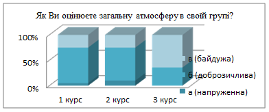 Отже, в результаті проведеного дослідження було виявлено, що найбільш адаптованими є студенти третього курсу, але саме у їхніх групах спостерігається байдужа атмосфера та часткова товариськість з одногрупниками. Студенти другого курсу не менш адаптовані ніж студенти третьокурсники, але вони ще не зовсім впевненні в своїх діях, вони ще не визначились чи правильним є їх вибір. Досить цікавим є той факт, що студенти першого курсу вважають себе повністю адаптованими, навіть за тих умов, що не з усіма студентами в групі вони встигли налагодити товариські відносини і їм не зовсім комфортно в університеті. Але найбільш цікавим є те, що, нажаль, студентів-першокурсників все влаштовує.