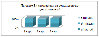 На запитання « Як часто Ви звертаєтесь за допомогою до одногрупників?» 50 % студентів першокурсників дали відповідь «часто», і 50% - «інколи». 35% студенів другого курсу часто звертаються за допомогою до одногрупників, 55% - рідко і 10% взагалі не потребують допомоги. 40% студентів третього курсу часто звертаються за допомогою до одногрупників, 60% - рідко. Отже, все ж таки студенти потребують допомоги від своїх одногрупників. (діаграма 8)