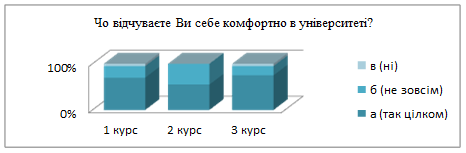Для того щоб остаточно визначити який із курсів більш комфортно відчуває себе в університеті, ми задали наступне запитання «Чи відчуваєте Ви себе комфортно в університеті?». На яке студенти відповіли наступним чином: 70% студентів першого курсу відповіли «так, цілком», 25% - «не зовсім» і всього 5% не відчувають себе комфортно в університет. Лише 55% студентів відчувають себе комфортно і 45% не зовсім. Як і очікувалось найбільш комфортно себе відчувають студенти третього курсу (75%), 20 % - не зовсім комфортно і 5%, нажаль, не відчувають себе комфортно в університеті. (діаграма 9)
