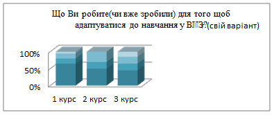 А чи роблять студенти КНУТД щось для того, щоб краще адаптуватися до умов навчального закладу? Для того щоб дати відповідь на це запитання ми поставили наступне запитання нашим студентам: «Що Ви робите (чи вже зробили) для того щоб адаптуватися до навчання у ВНЗ?». У результаті чого отримали наступні відповіді: 65% студентів першокурсників намагаюсь добре вчитись, щоб привертати до себе увагу викладачів та одногрупників, 15% шукають нові знайомства, 15% нічого не роблять і 5% вважають, що вони вже адаптувались і нічого робити не потрібно. Студенти другого курсу також намагаються добре вчитись (50%), 20% - шукають нові знайомства і 30% нічого не роблять. 45 % студентів третьокурсників намагаються добре вчитись, 20% - шукають нові знайомства, 20% - нічого не роблять і 15% вважають, що вони вже адаптувались і нічого не роблять, а просто ходять до університету. (діаграма 10)