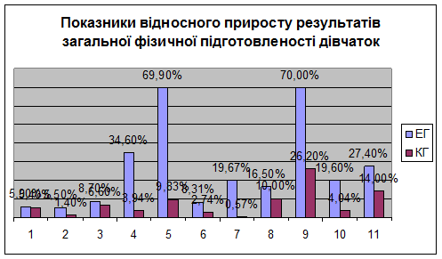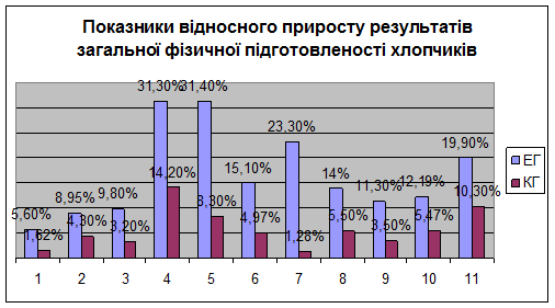 Середній відносний приріст у загальній фізичній підготовленості у хлопчиків експериментальних класів становив 24 %, конрольних – 5,7 %. У дівчаток 26 % та 6,73 % відповідно.