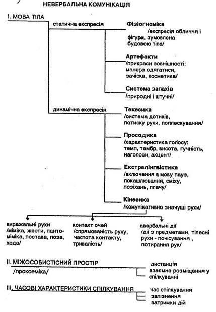 Скористаємося схемою Е. В. Кузнецової. Ця схема свідчить про широку палітру засобів вираження людиною свого ставлення, і вчитель мусить працювати над розширенням і вдосконаленням репертуару впливу не-вербальними засобами. Звичайно, не всі вони рівнозначні, проте кожен з них зчитується вихованцями, підсилюючи або нейтралізуючи враження від слів педагога. Дослідження засвідчують, що невербальні засоби, зокрема жест, можуть мати більше ваги у спілкуванні, аніж слово. Так, коли ми говоримо "Ти гарний хлопчик" і водночас супроводжуємо висловлювання жестом негативної оцінки (похитування головою), то 85 % сприймуть цю інформацію за змістом жесту, а не слова. Отже, до зовнішньої техніки вчитель мусить бути дуже уважним. Розгляньмо деякі з її елементів.