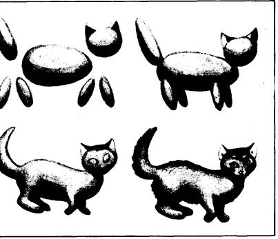 Наприклад, у котика тулуб видовженої циліндричної форми з пластичними передніми і задніми кінцівками, голова — кругла з короткими гострими вушками. Ліпити котика найпростіше з окремих частин. Спочатку треба виліпити тулуб з ніжками і голівку, врахувавши їх пропорції та форму. Потім приєднують інші частини (вушка, хвостик).