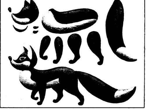 Розглянемо, наприклад, форму іграшкової лисиці. У неї маленька голівка, загострена до носа, видовженої форми тулуб, довгий хвіст, короткі тонкі лапи. Ліпити лисицю краще з одного видовженого шматка, якому надають характерної форми довгастого тулуба з невеликою голівкою і довгим хвостом. Лапи ліплять окремо, дотримуючись пропорцій натури.