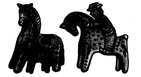 Іграшки-свистунці. Кінець дерев’яної палички завдовжки 7-10 см та товщиною 0,5- 1 см обліплюють глиною та добре обтискають. Виліплюють свистунець у вигляді птаха, барана або коника. Знімають із палички та закривають отвір, затиснувши пальцями глину. Після цього знову заструганою на конус паличкою, але тонкою, роблять новий отвір з торця перпендикулярно знизу або зверху. Він повинен з’єднуватися з утвореною камерою. Всі отвори пробивають дуже акуратно. Випробовують, чи свистить виріб. З першого разу не завжди це вдається, але регулюючи отвори, ви можете досягнути успіху. Велика камера дасть низький звук, менша – високий. Потім виріб декорують.