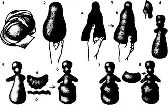 Із шматка глини величиною з куряче яйце скачайте в руках кульку. Втисніть у неї вказівний палець на глибину приблизно двох фаланг. Перетисніть лівою рукою кульку в середині, розділивши її на дві частини. Нижня частина повинна бути більшою ніж верхня. Із верхньої частини ліплять тулуб, голову та руки, із нижньої – спідничку у вигляді дзвоника. Глибина спідниці-дзвоника повинна співпадати з довжиною вказівного пальця. Щоб зробити форму дзвоника, глину поступово обминаємо навкруги вказівного пальця. Коли товщина стінок буде приблизно 5-6 мм, переходимо до ліплення тулуба, голови та рук. Глину, яка знаходиться зверху, розділяємо на дві частини так, щоб верхня була менша, ніж нижня. Із нижньої виліплюємо тулуб та руки, а із верхньої – голову.