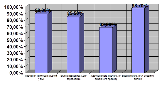 Як зазначалось у першому розділі магістерської роботи, дана проблема характеризується певними причинами. В результаті анкетування були отримані такі результати щодо визначення причин педагогічної занедбаності школярів: