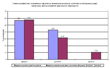 Районними, міськими відділами і управліннями освіти, як правило, здійснюється вивчення та оцінювання результатів діяльності навчально-виховних комплексів (об'єднань)"загальноосвітній навчальний заклад-дошкільний навчальний заклад", "дошкільний навчальний заклад-загальноосвітній навчальний заклад". На думку респондентів, розповсюдженими формами є тематичні перевірки (85,7% керівників органів управління освітою, 78,9% керівників НВК), тестування (71,4%, 57,9%), анкетування(57,1%, 63,2%), рідше застосовуються моніторингові дослідження та рейтингова система.